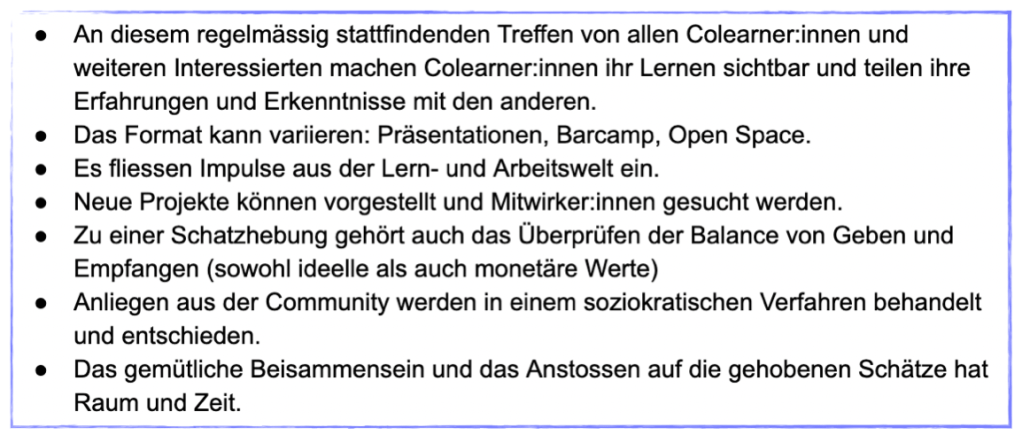 Anders gesagt: „Colearner:innen arbeiten selbstbestimmt und selbstorganisiert. Wir übernehmen Verantwortung für das eigene Lernen und unterstützen andere in ihrem Lernen. Wir sind eine Gemeinschaft, die Lernen immer wieder sichtbar macht, Lernerfahrungen reflektiert und diese mit anderen teilt. Colearning ist ein Geben und Empfangen. Unsere Lernkultur funktioniert nur, wenn wir alle bereit sind, uns in der Weise einzugeben.“ (Quelle)