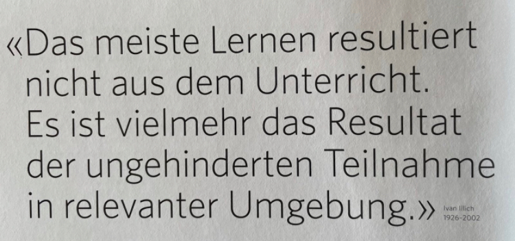 Lernende und lehrende Menschen zeigen nicht, was sie wissen, sondern was sie mit ihrem Wissen bewirken – in Projekten, in Gemeinschaft, in realen Auseinandersetzungen mit Welt. Der Massstab ist nicht eine Note, sondern die Resonanz, die ihre Ideen auslösen.