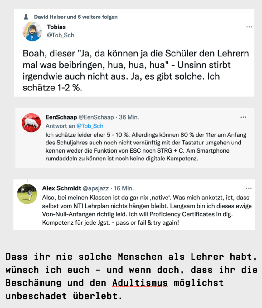 weil die Struktur des Unterrichts Kooperation auf oberflächliche Sozialformen reduziert: Gruppenarbeit ohne echte gemeinsame Zielorientierung, „Partnerarbeit“ ohne Verhandlung. Wirkliche Kollaboration – also das gemeinsame Gestalten, Verhandeln, Entscheiden und Lernen auf Augenhöhe – braucht Zeit, Raum, Verantwortung und offene Prozesse. Der Unterricht jedoch ist auf individuelle Leistungserbringung, Vergleichbarkeit und Steuerbarkeit ausgelegt. Teamfähigkeit wird proklamiert, aber nicht strukturell ermöglicht.