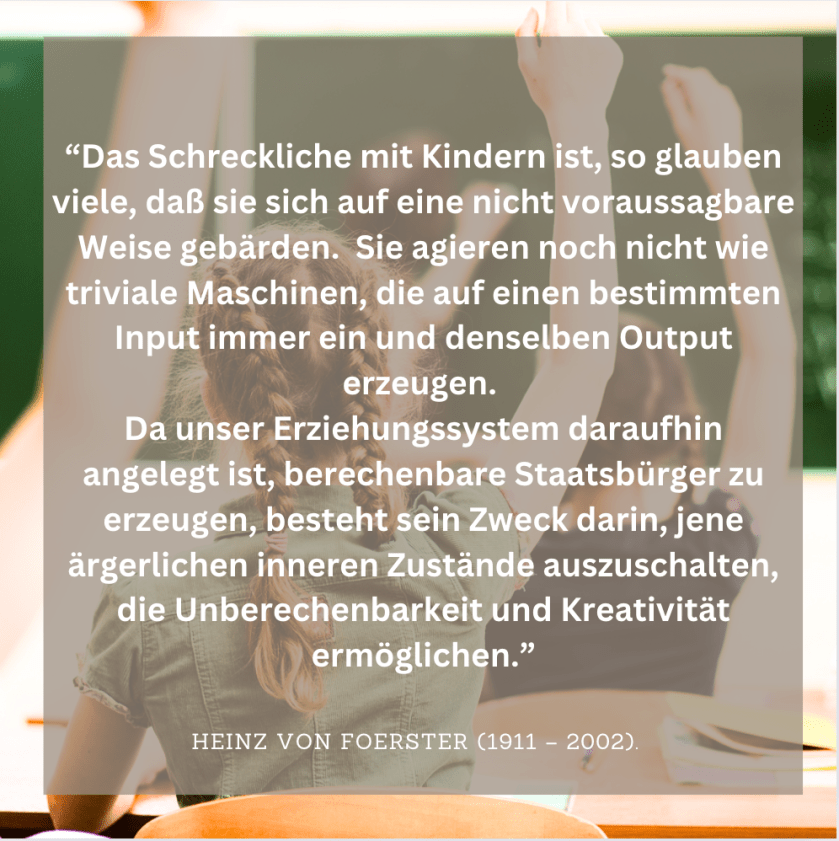 - Kindliche Entwicklung ist nicht linear steuerbar. Entwicklung folgt keinem Plan. Wer vorgibt, Kinder gezielt zu bilden, überschätzt nicht nur seine Macht, sondern verfehlt das Subjekt. Gerade diese Fehleinschätzung ist Teil einer systemischen Verirrung, die seit der Gründung des modernen Schulsystems tief verankert ist, und die dieses System auf Kosten des Lernens stabilisiert.