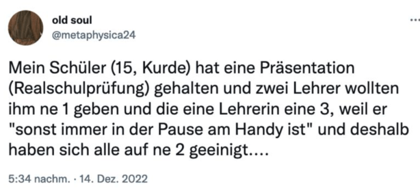 Dabei obliegt das Geschäft der Bewertung und Benotung, inklusive dessen Reflexion den Repräsentant:innen des Schulsystems, und zwar nach Kriterien, auf die Lernende keinen Einfluss haben, nach Kriterien, die Lernende noch immer über weite Strecken als Willkür erleben.